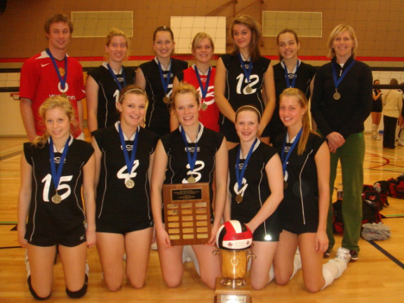 For the second year in a row, the Senior 'A' girls volleyball team have brought home gold from the Independent School Championships. This year's tournament was hosted by Brentwood and had 10 teams competing for the coveted title. During round robin play, Brentwood defeated Glenlyon Norfolk House 25-11, 25-17; Meadowridge 25-10, 25-8; Mulgrave 25-13, 25-18; and York House 25-17, 26-28. In the semi-finals, Brentwood defeated West Point Grey Academy with scores of 25-21, 25-8. In the final Brentwood prevailed over Crofton House after an exciting 3-set match with scores of 25-15, 22-25, 15-3. Captain Anne Huis in 't Veld had a great weekend as did Tessa Felix and libero Mariya Young.